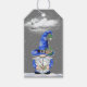 Cute Christmas gnome with clock, snowflakes and clouds on a grey background.