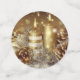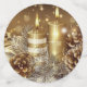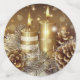 A beautiful photo of gold and white candles burning with acorns and ornaments, gifts and snow
