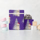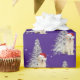 Cute golden retriever puppy with Santa hat and white holiday tree in snowflakes on a purple background.
