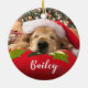 How about a cute ornament to make your holidays merry this year? Design features a photograph of a golden retriever dog who is asleep on a pillow under a Christmas tree and wearing a red Santa hat. Personalise with a name or phrase.