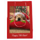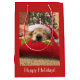 Merry Christmas! Show your holiday spirit with this cute gift bag! Design features a photograph of a golden retriever dog who is asleep on a pillow under a tree and wearing a red Santa hat. Customisable text reads, "Happy Holidays!"