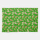 Cute Christmas dogs in festive holiday outfits. Golden Retriever with light and medium golden coats wear Santa hats, antlers, sweaters on a green background with scattered ornaments.