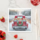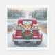 An old red truck decorated with a festive wreath carries a group of playful Golden Retriever puppies through the snowy countryside