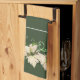 This holiday designed kitchen towel features a hunter green background with whimsical green glitter swirls and a trio of white poinsettias. Use this festive towel at Christmas and throughout the winter season. This towel will look lovely when coordinated with a white themed Christmas colour scheme.