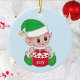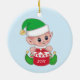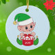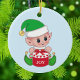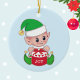 Cute Christmas elf with gift box on light blue Ornament. Elves are believed to be earth little angels. Joy text can be personalised with a short text or monogram.