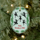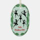 Ballerina, dancer ornament with name, year, and photo. Green pine borders on both sides of oval tree ornament. Five ballerina silhouettes are leaping and doing pirouettes. Add her name and year beneath the dancers in red script. Use the template on the back to upload a portrait of the dancer.