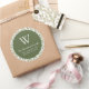This festive Christmas return address sticker features an olive green circle on a watercolor pattern of winter greenery, including evergreen pine trees and holly sprigs with red berries, on a white background. Personalise the design with your monogram initial and family name in white serif font, with your address below in sans serif.