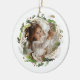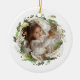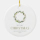 This elegant Christmas ceramic ornament features a delicate watercolor wreath of greenery, soft foliage, and subtle red berries encircling a customisable photo, adding a personal touch to your holiday decor. The "Merry Christmas" greeting is printed in an elegant serif font, with options to add a family name and year, making it a cherished keepsake or thoughtful gift for loved ones. Perfect for decorating the tree or adding a festive touch to your home, this ornament brings warmth, style, and holiday cheer to your seasonal decorations.