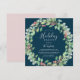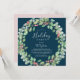 This Christmas greenery wreath navy holiday party invitation card is perfect for a simple holiday event. The winter holiday design features soft sage green watercolor eucalyptus and modern botanicals with sprigs of classic red holly berries.