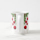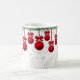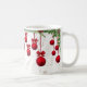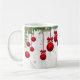 Red dangling Christmas ornaments, suspended from a swag of conifer boughs and holly sprigs, superimposed on a background of light-coloured foliage drawings, makes a beautiful Mug for the holidays!