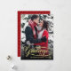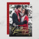 Celebrate the Christmas season with these simply elegant family photo cards. The cards include your custom picture on the front, along with a soft black gradient along the bottom edge, and word "Greetings" in beautiful gold faux glitter brush script, a small snowflake, and your text. The back has a festive red background color (that can be customized to any shade), a gold glitter dot border, and more of your text. Make changes with the easy templates. Personalize further to rearrange and resize elements.