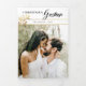 Trendy modern custom "Christmas Greetings" script photo template with gold-bordered band for personalisation and elegant glam gold leaves. Panels feature additional photo and text templates.