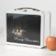 The card shows an atmospheric, wintry scene with a small, illuminated wooden hut in the middle of a snow-covered forest. The warm light source inside creates a beautiful contrast to the dark, peaceful surroundings. The elegant "Merry Christmas" lettering in white gives the motif a festive touch. 🎄✨