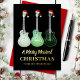 Christmas guitars wearing Santa hats black and gold foil custom holiday card. Christmas just got cool and musical with this guitarist musician or music lovers personalised merry musical Christmas personalised gold typography festive card. Three modern semi acoustic guitars in green pop art hues wearing santa hats completes this fun unique hand drawn design. Unique original artwork by artist Catherine Sweetman