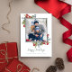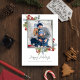 This design features Christmas holiday red holly berries, with photo 1 one family picture layout, botanical greenery winter foliage, a watercolor red green blue silver, elegant pine branch twig branches, classic traditional eucalyptus leaves, and-lettered script calligraphy, with modern calligraphy script font, modern elegant simple trendy, a lovely Christmas holiday photo greeting card