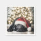 A black Labrador Retriever wearing a Santa hat lies on a wooden floor with a beautifully blurred Christmas tree glowing in the background