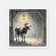 A Hereford cow stands in a barn doorway, illuminated by a lantern, wearing a Santa Claus hat