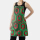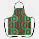 This apron has a geometric design of hexagons in four shades of green on a field of stripes in two shades of red.
