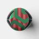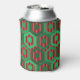 This can cooler has a geometric design of hexagons in four shades of green on a field of stripes in two shades of red.