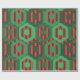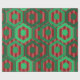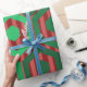 This wrapping paper has a geometric design of hexagons in four shades of green on a field of stripes in two shades of red.