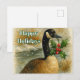 This holiday postcard showcases a watercolor illustration of a Canadian Goose adorned with holly leaves and berries. The greeting can be customized, or purchased as displayed with "Happy Holidays."