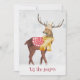 Big buck deer with winter scarf and red text on silver snowflake background.