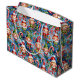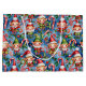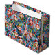 Unique Christmas pattern featuring elves and Christmas holiday decor on a blue background.