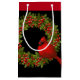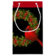 This Christmas holiday gift bag is shown in black with a red trim and a festive wreath and cardinal bird art print.