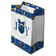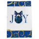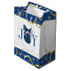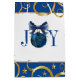This large size gift bag is shown in a fanciful bold golden coloured swirls and stars borders with a cute ornament with a bow in blue. Shown in Sapphire Blue and gold-tone over white background.