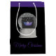 This fun gift bag is shown in black with Purple trim at top, a snow globe complete with bright purple crown with snow falling, Purple Merry Christmas greeting at bottom. Images are on both sides of the bag, with white Nordic-look snowflakes on the sides.