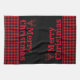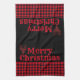 This kitchen towel is shown in a cute festive Christmas holiday black and red buffalo plaid print design with a buffalo plaid reindeer head on each end. Text of Merry Christmas over black background. Red pinstripe just above the buffalo plaid.