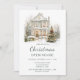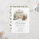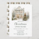 Festive Christmas party invitation featuring a beautiful house with Christmas trees, snow, fairy lights and garlands. Perfect for an Open House Party. The words can be changed to suit your own details or requirements