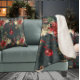A Christmas winter holiday design featuring a dark green woodland forest winter's night background with shimmering gold snowflakes, poinsettias, glowing lanterns, pine cones and red berries with a red ball ornament on red ribbon falling on a warm and cosy sherpa blanket making it a great holiday gift idea.