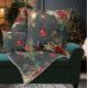 A luxurious and festive Christmas winter holiday design featuring a dark green forest winter's night background with shimmering gold snowflakes, watercolor-painted poinsettias, a glowing lantern, pine cones and red berries with a shining red ball ornament on red ribbon falling on this cosy winter throw blanket.