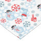 This table runner to accent your table decor is shown in a festive Christmas Holiday snowman and snowflakes print design.