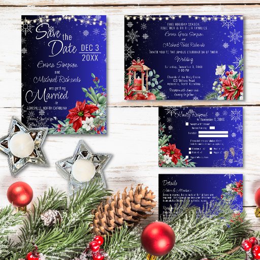 Spark up some holiday excitement for your special day with this elegant wedding save the date invitation - a deep blue gradient and snowflake background on the front and back. One side holds a beautiful pine cone design. The other holds the quick details of your upcoming nuptials under a string of lights with your date, names, and location. There's also a pretty corner display of poinsettias and evergreens.
