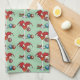 A cute red dragon in a martini glass holding a green olives. Ornaments, green olives and a present all around him