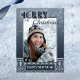 An ugly sweater photo template postcard with Merry Christmas and a Happy New Year wishes. The design shows a navy blue pattern with sparkling snowflake lights. Great for both personal use as well as a corporate purpose to say Thank You to customers.