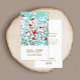 Simple red and white berry branches with leaves on aqua blue background.