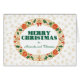 A festive Christmas card to personalise with any name or family relative, with a Christmas wreath of Holly, Ivy, Poinsettias, Fir Cones, Christmas Roses and a matching red bow, outlined in gold-effect, with gold-effect snowflakes on a white background.