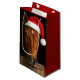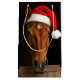 A horse wears a red Santa hat as it peeks out from a wooden stable, its warm tones beautifully contrasting with the festive colors.