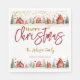 A gorgeous Christmas napkin. This glamourous gold and red holiday design features a snowy street scene with houses and trees.. Easy to customise with your own Holiday party or dinner details.