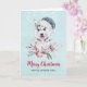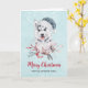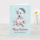 Christmas card with a whimsical and cute watercolor painting of a husky dog wearing a blue Santa hat.