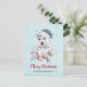 A postcard with a whimsical and cute watercolor painting of a husky dog wearing a blue Santa hat.