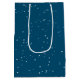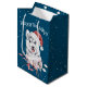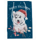 Husky dog wearing Christmas Santa Claus hat in snowflakes on blue background.