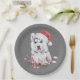 Husky dog with Christmas Santa Claus hat in snowflakes on grey background.