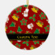 Set of christmas icons. Santas head, christmas tree, bells, christmas holly, and poinsettia. Custom background colour. Seamless pattern. Custom text on both sides.