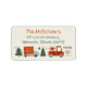 Modern Christmas holiday illustration return address labels. Easily edit with your mailing address details. This design features and illustration of a mail truck, christmas trees, gifts and more.