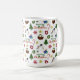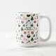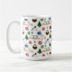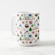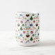 Christmas colourful surface pattern design with illustrations of a Christmas pudding, star, baubles, snowflakes, snowman, candy cane, Christmas tree, Christmas gift parcels and stocking.