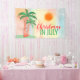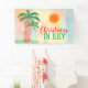 Invite family and friends to your Christmas themed celebration and decorate it with this island style banner featuring hand drawn palm trees decorated with lights on a watercolor background.